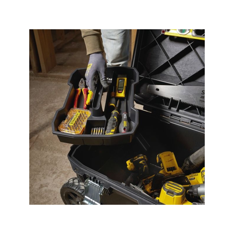 En polypropylène. Attaches métalliques anticorrosion et serrure à clés. Roues grand diamètre tout terrain, poignée télescopique bi-matière. Rainure en V pour des découpes d'appoint. Nombreux rangements verticaux et plateau porte-outils intégré. Etanche à l'eau et à la poussière (IP54). Volume utile : 113 l Dimensions : 910 x 520 x 430 mm. Livré sans outils.