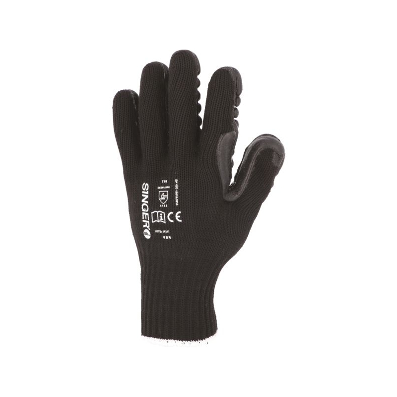 Enduction de mousse de caoutchouc (chloroprène) sur paume. Support tricoté en polyester et nylon®, jauge 7. Dos aéré, poignet élastique. Protection dissipant les vibrations et les impacts. Manutention lourde / Milieu sec Applications métiers : outillage vibrant, marteau piqueur Taille : 9 et 10 Norme : CE Cat II - EN 388 (4142X) - EN ISO 10819