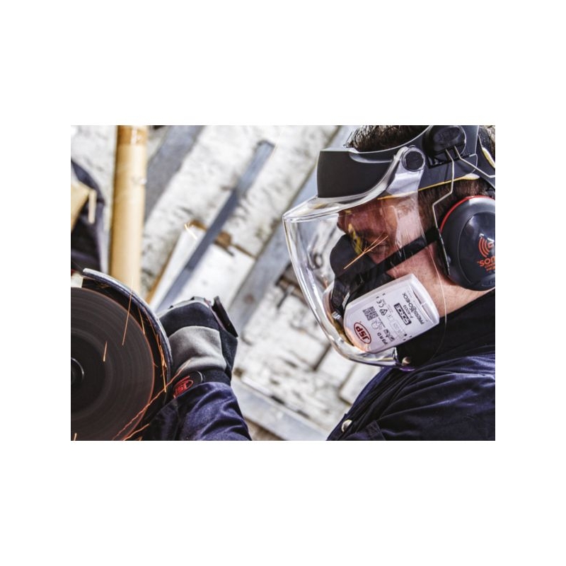 Composé d'un porte-visière, d'une visière et d'une paire de coquilles antibruit. Protection contre les impacts, les projections de liquides et les métaux fondus. Porte-visière avec serrage crémaillère avec coussin de confort à ressorts. Basane extra-longue. Visière en polycarbonate. Equipé de coquilles anti-bruit Sonis® (SNR de 31 dB) réf. 19389. Poids : 655 g Norme : CE Cat II - EN 166 - EN 170 - EN 352-3